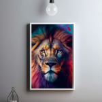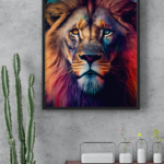 Acest tablou captivant înfățișează un leu în toată splendoarea sa, cu o paletă vibrantă de culori ce sfidează realitatea.